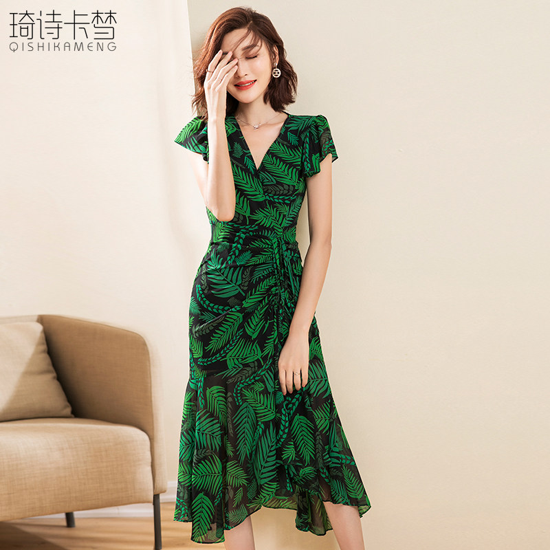 植物系V领雪纺连衣裙女夏绿色收腰显瘦中长款气质裙子夏季修身v领