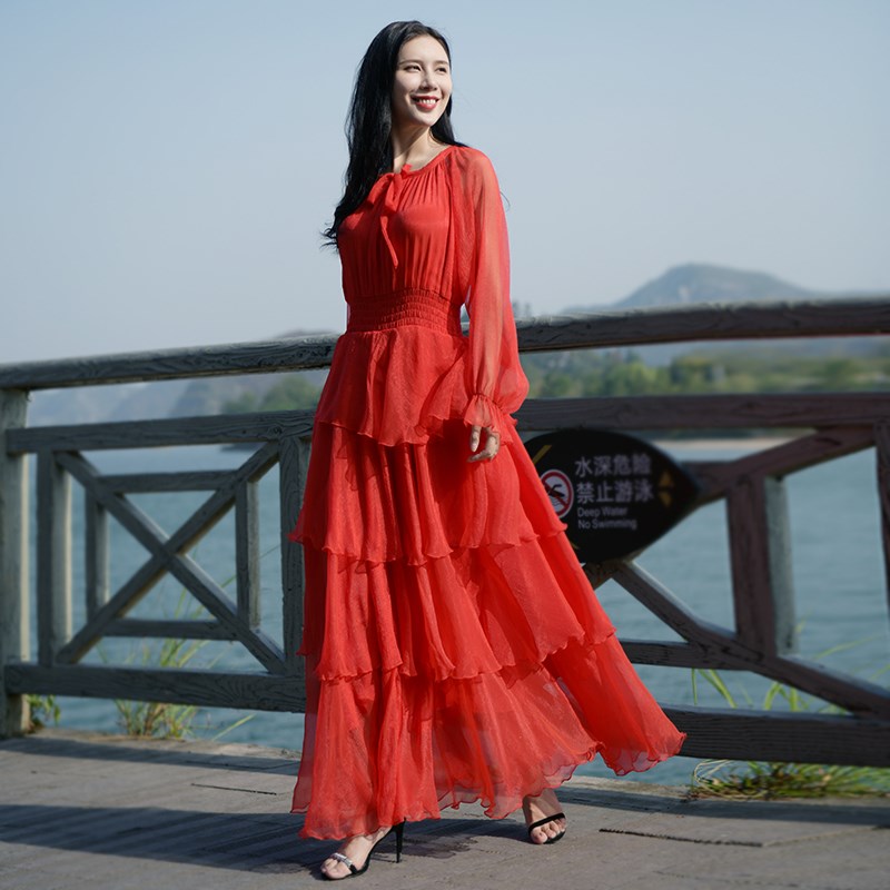 春夏新款V领长袖雪纺连衣裙女气质大摆修身显瘦沙滩度假长款裙子