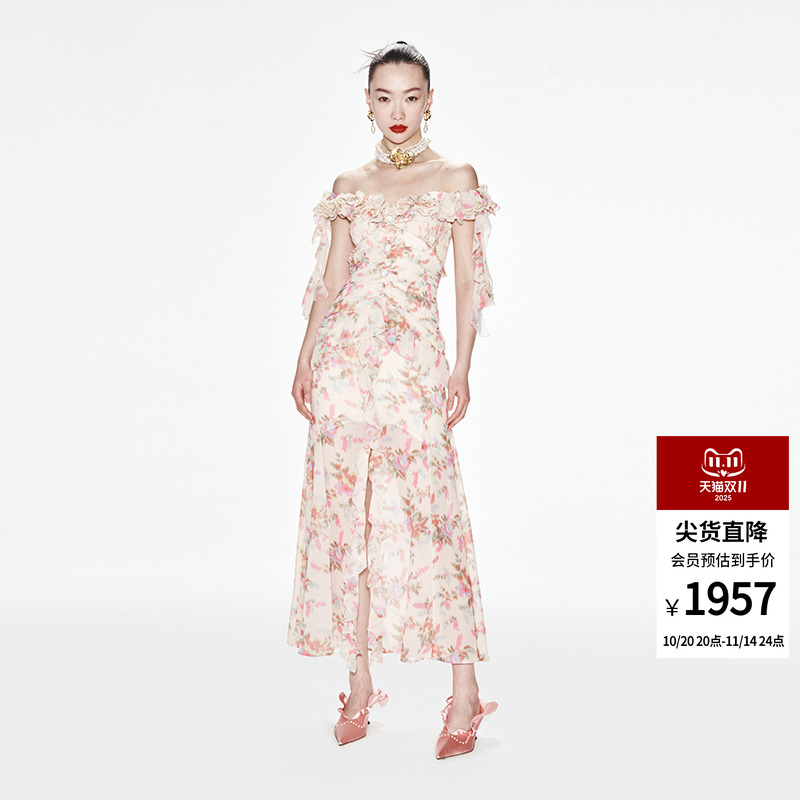 Acaine玫瑰气泡水/粉色长款印花雪纺修身吊带连衣裙女夏法式裙子
