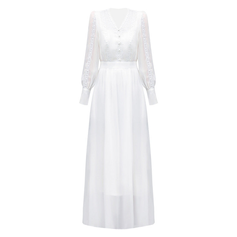 白色雪纺连衣裙女春装新款名媛V领蕾丝长款裙子修身显瘦沙滩裙仙