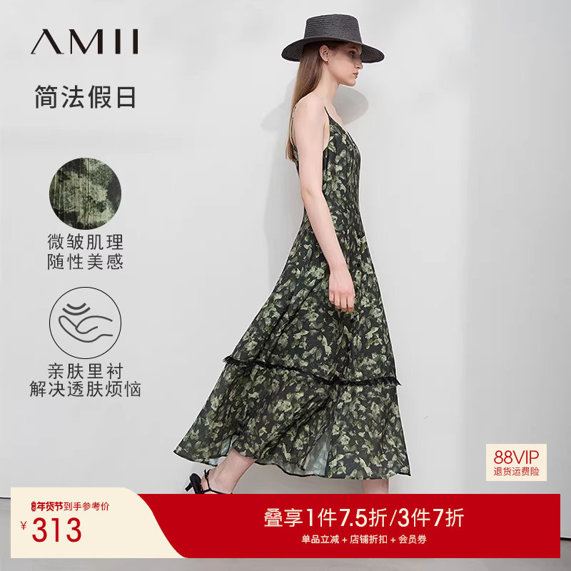 Amii2025夏新款度假风修身长款无弹印花雪纺V领吊带连衣裙