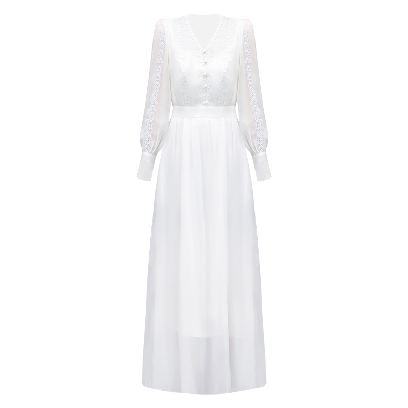 白色雪纺连衣裙2022新款春名媛V领蕾丝长款裙子修身显瘦沙滩裙仙