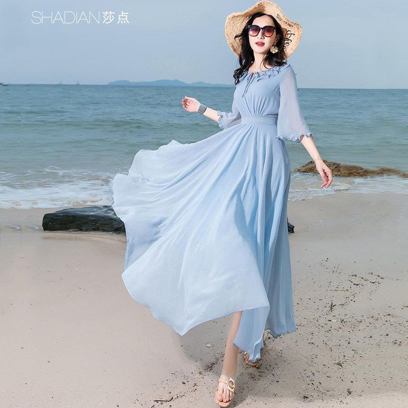 莎点长款连衣裙2022夏雪纺修身洋气显瘦仙女大摆长裙飘逸沙滩裙子