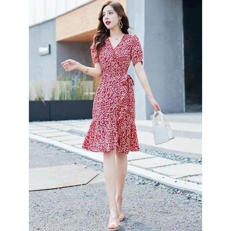 2025独家定制DF裹身裙系带修身显瘦V领雪纺碎花连衣裙女夏中长款