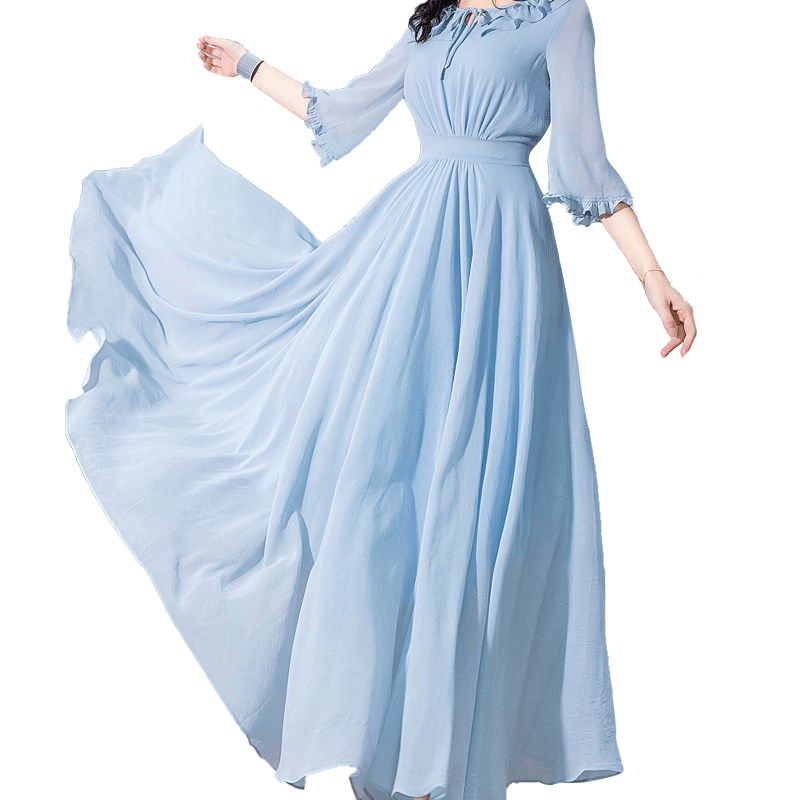 春夏新款长袖系带领纯色雪纺连衣裙女修身显瘦沙滩度假长款大摆裙
