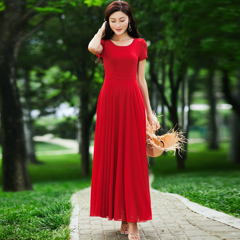 长裙夏连衣裙女2021新款气质雪纺修身沙滩裙大摆显瘦红裙子超长款