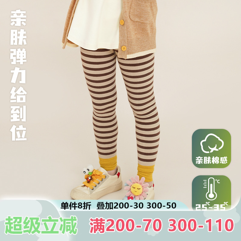 mibi儿童打底裤春秋季新款女童紧身裤子双层条纹拼色宝宝女针织裤