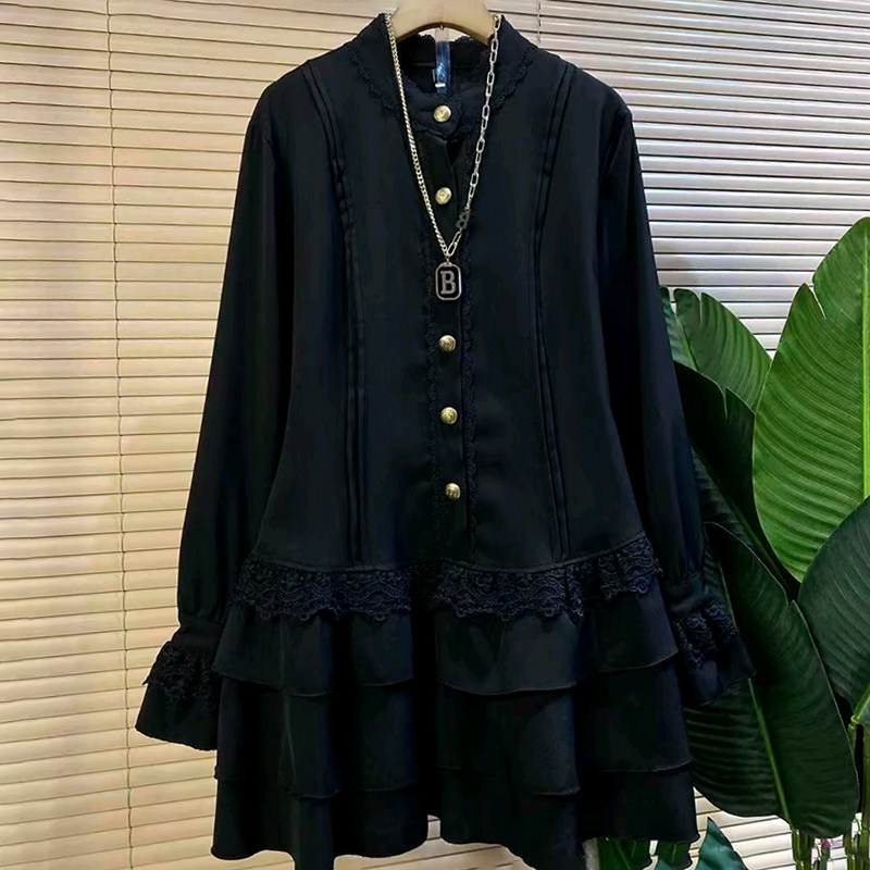 加肥立领荷叶边中长款名媛风时尚淑女裙胖妹妹小众设计蕾丝连衣裙