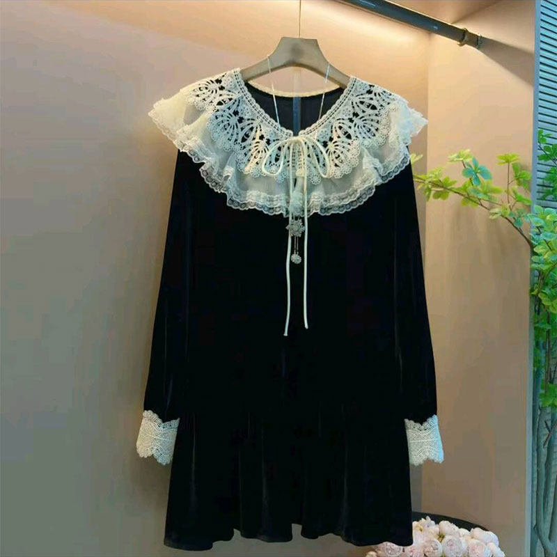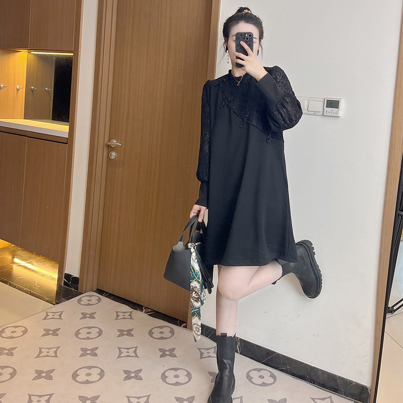大码女装拼色蕾丝领长袖连衣裙胖妹妹中长款法式气质赫本风小黑裙