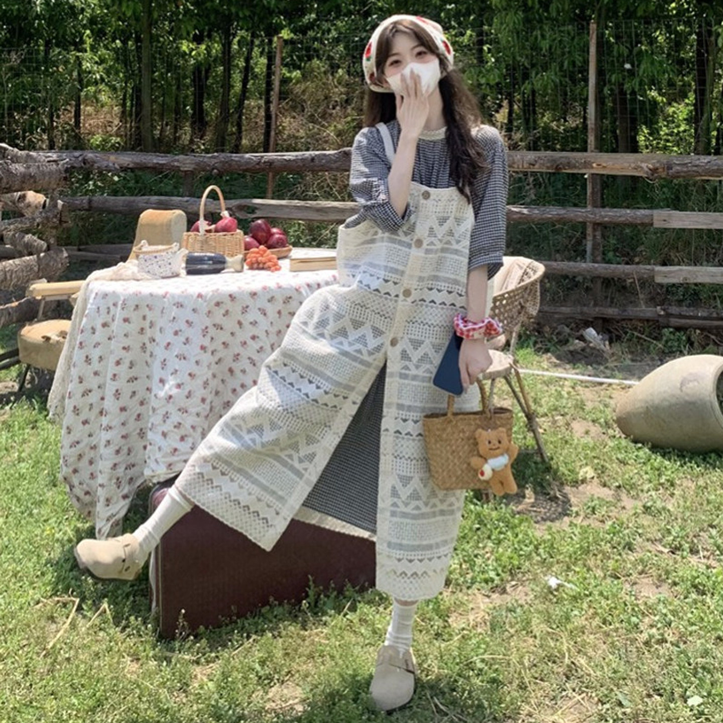 大码女装2025胖mm复古蕾丝吊带裙+慵懒格子连衣裙时尚叠穿两件套