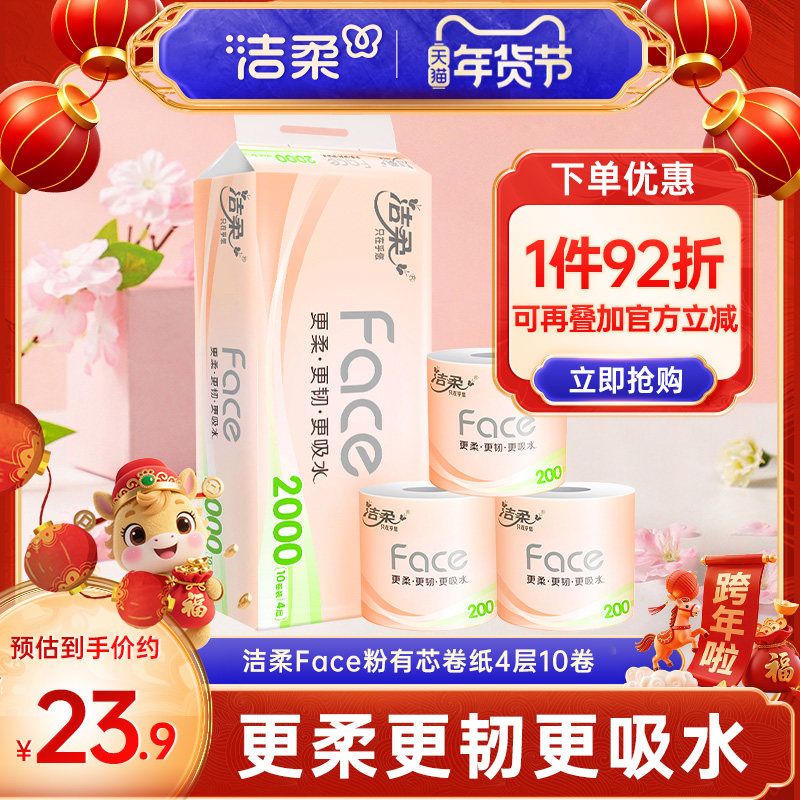 洁柔卫生纸Face粉有芯卷纸4层200g10卷装更柔更韧家用卷纸实惠装R