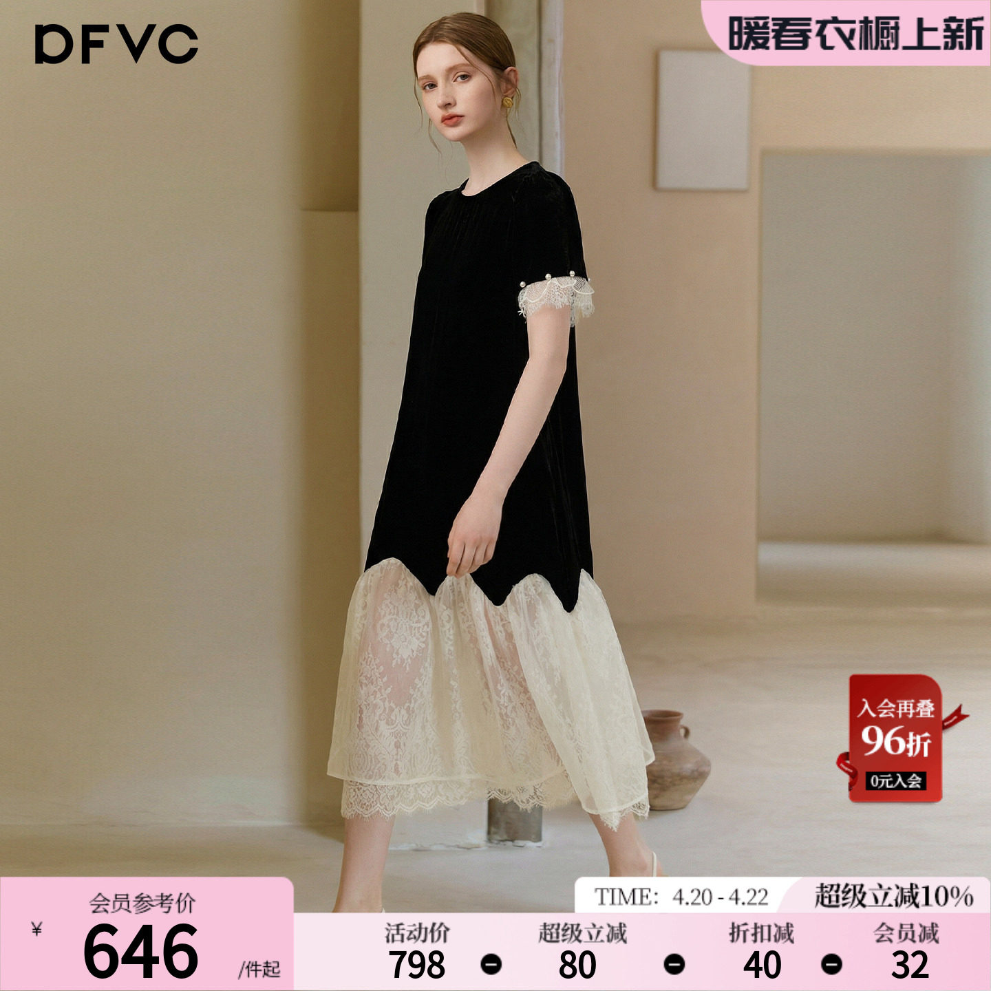 dfvc洋气桑蚕丝真丝丝绒连衣裙女2026年夏季新款蕾丝拼接中长裙子