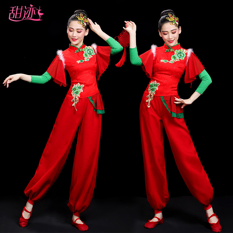 秧歌舞演出服装中式古典广场套装喜庆红歌扇子舞蹈服装伞舞表演服