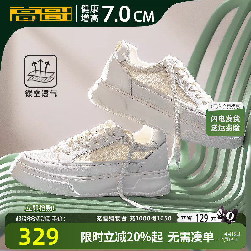 高哥增高板鞋厚底夏季镂空透气男鞋真皮轻便运动鞋子内增高小白鞋