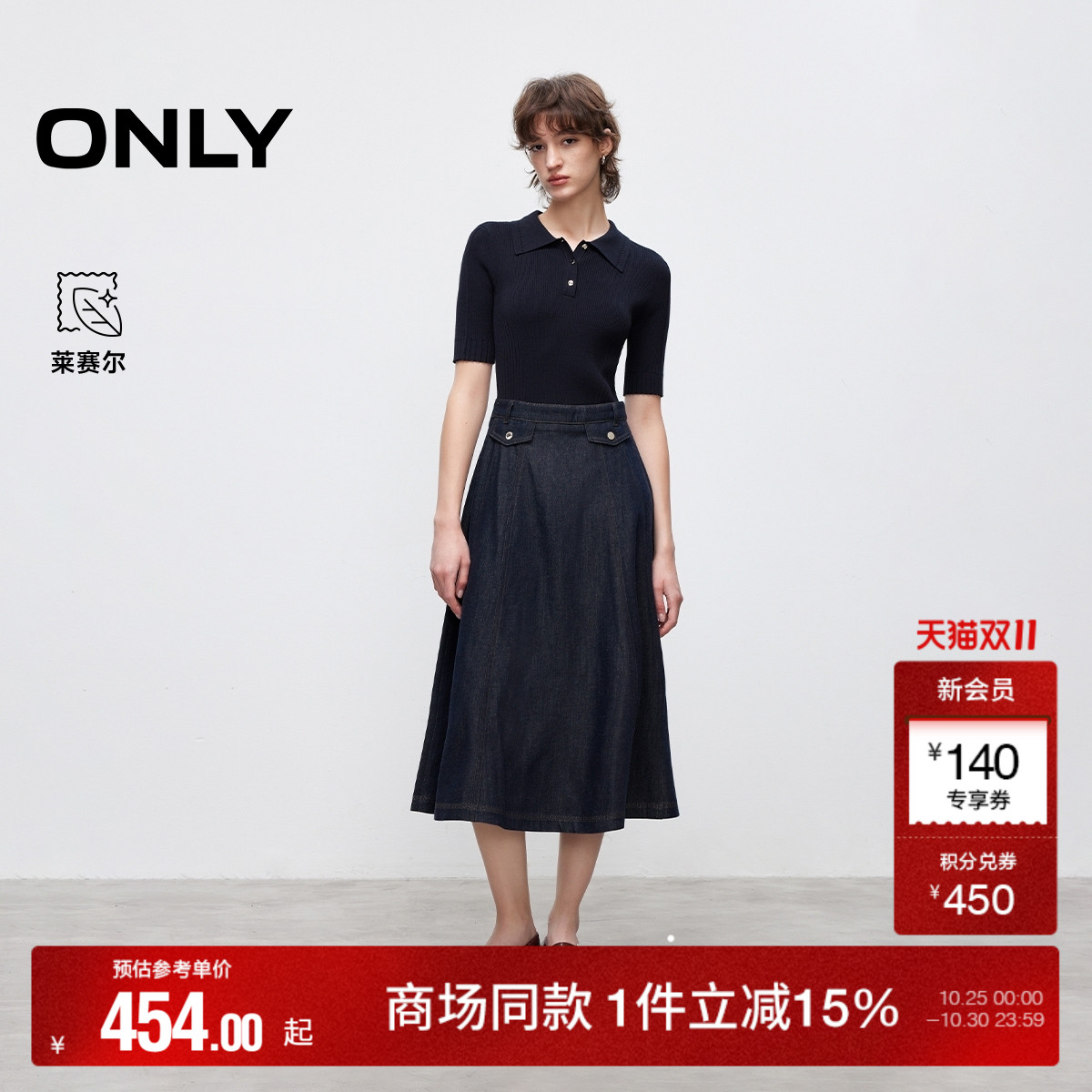 ONLY2025秋季新款针织牛仔拼接A型伞摆假两件短袖中长裙连衣裙女