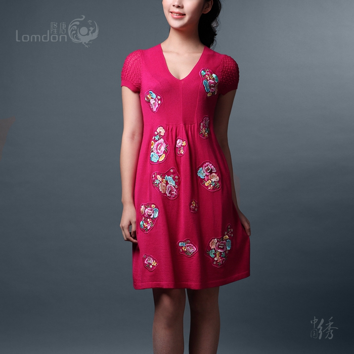 隆唐精致A型贴布棉针织衫大码宽松高腰短袖套头V领连衣裙绣花L258
