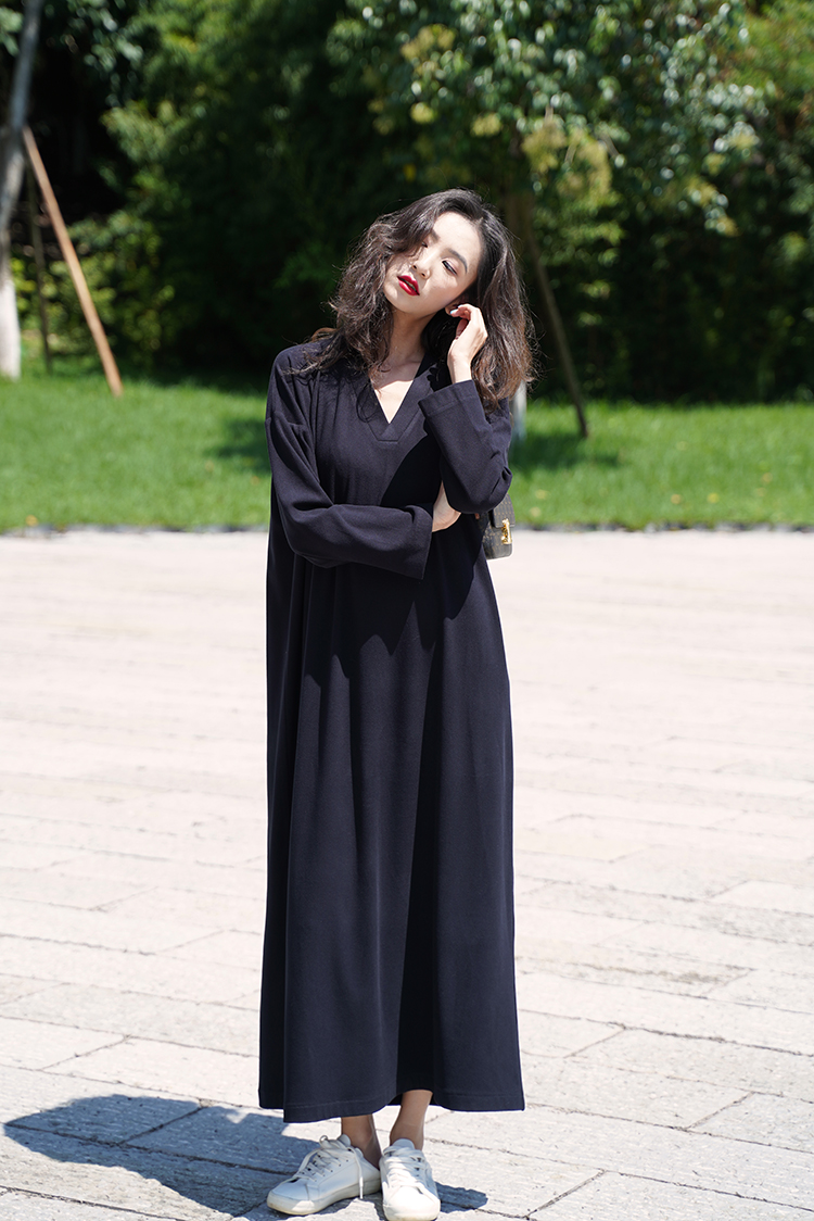 V领显瘦气质连衣裙春季新款长款针织长裙女黑色a型宽松袍子连衣裙