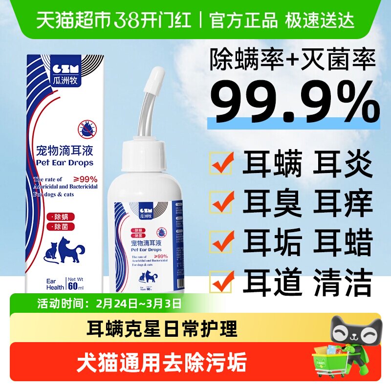 宠物滴耳液60ml猫用猫咪耳朵清洁用品狗狗金毛洗耳液消炎除螨专用