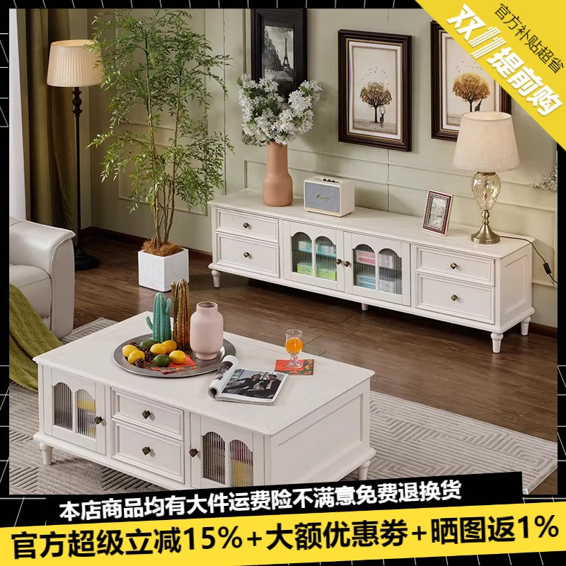 美式实木茶几电视柜组合仿古白简约客厅茶水柜小户型白蜡木储物柜