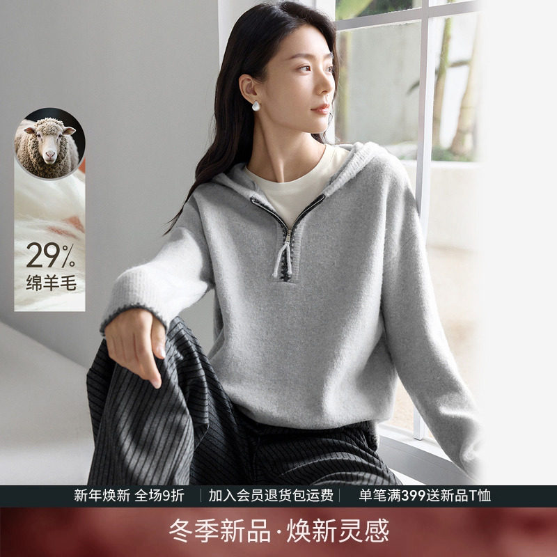 IHIMI海谧绵羊毛套头针织衫女冬季宽松毛衣连帽内搭上衣毛织卫衣