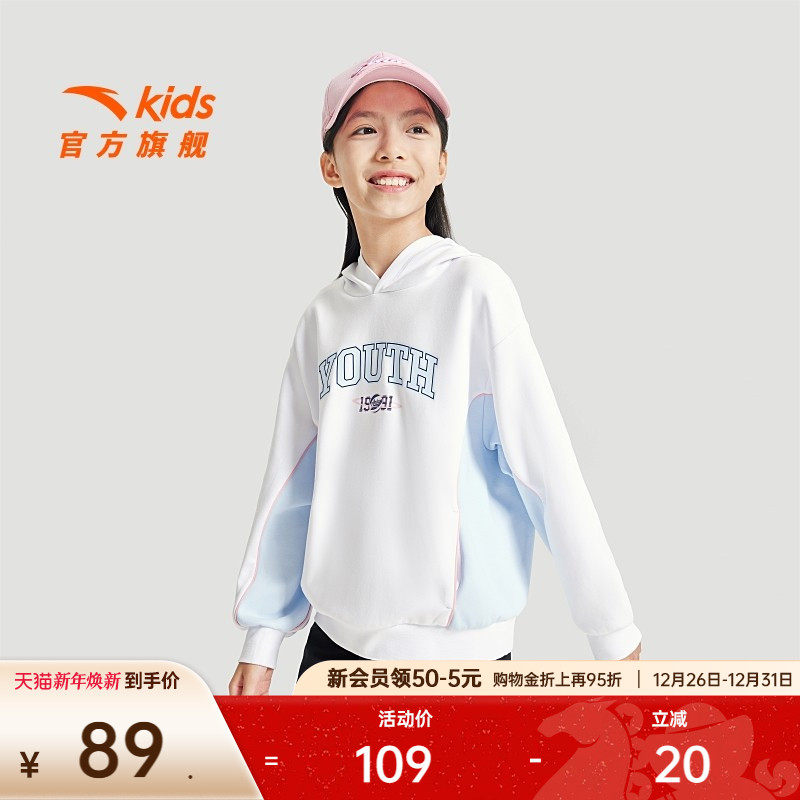 安踏儿童女大童针织连帽套头衫2025冬季新款拼接亲肤运动休闲卫衣