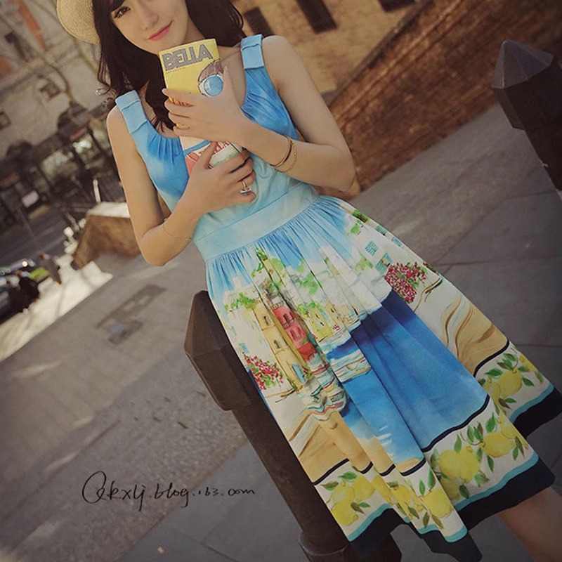 欧美大牌夏装新款裙子女装无袖印花连衣裙收腰修身气质中长裙显瘦