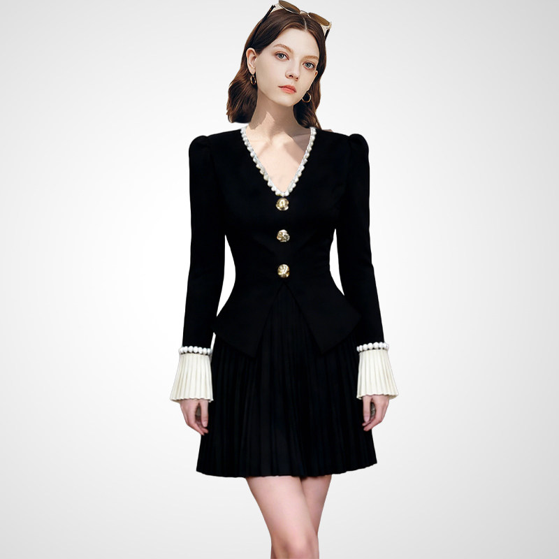 兰卡时尚职场轻熟风小香风黑色连衣裙女2026春款泡泡袖通勤百褶裙