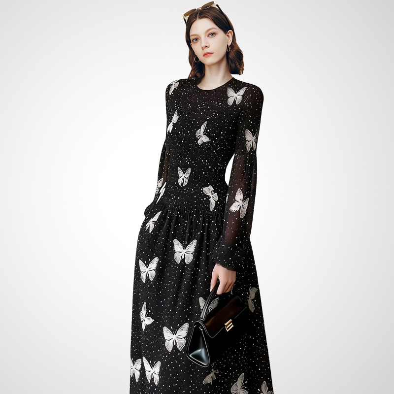兰卡时尚法式千金风黑色蝴蝶印花连衣裙2026春款长袖收腰气质长裙