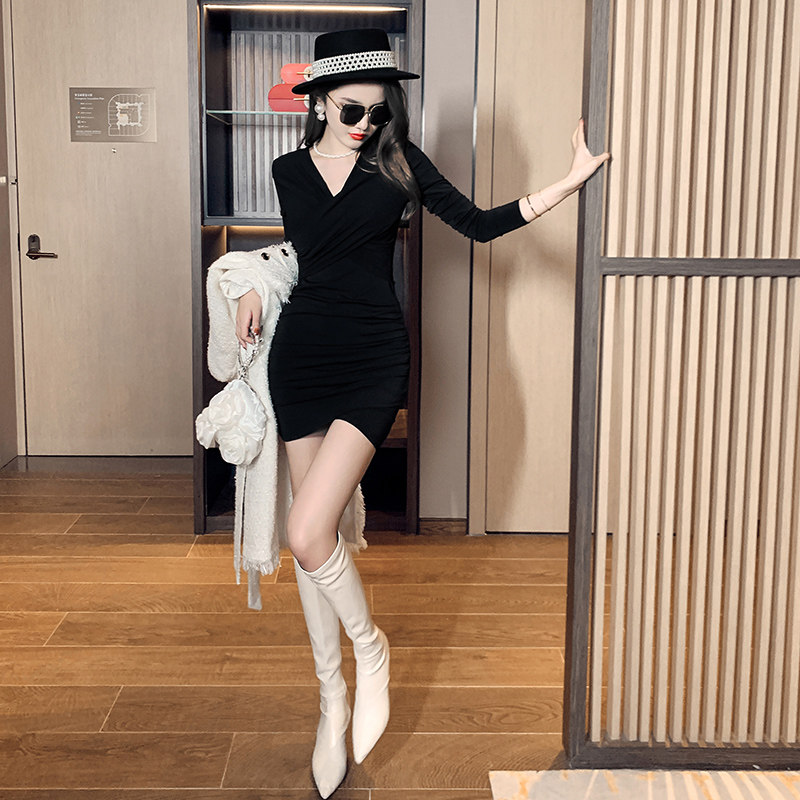 百搭气质V领黑色打底连衣裙赫本风内搭长袖包臀裙子2024春款女装