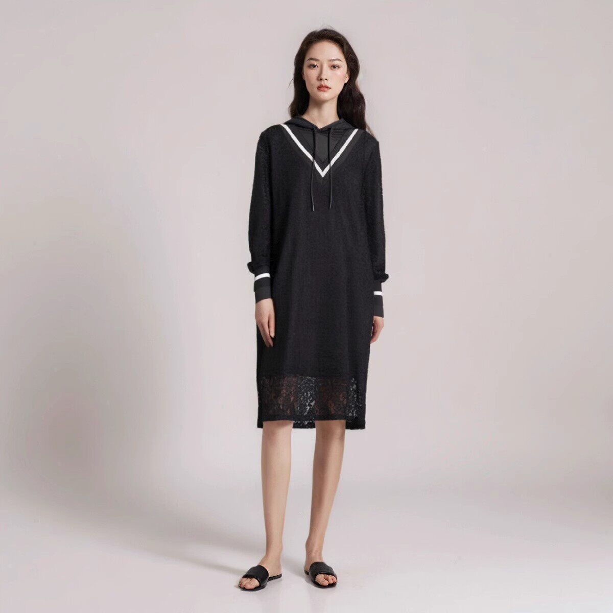 百搭黑色纯棉袍子式卫衣连衣裙原创设计2026春款宽松显瘦简约长裙