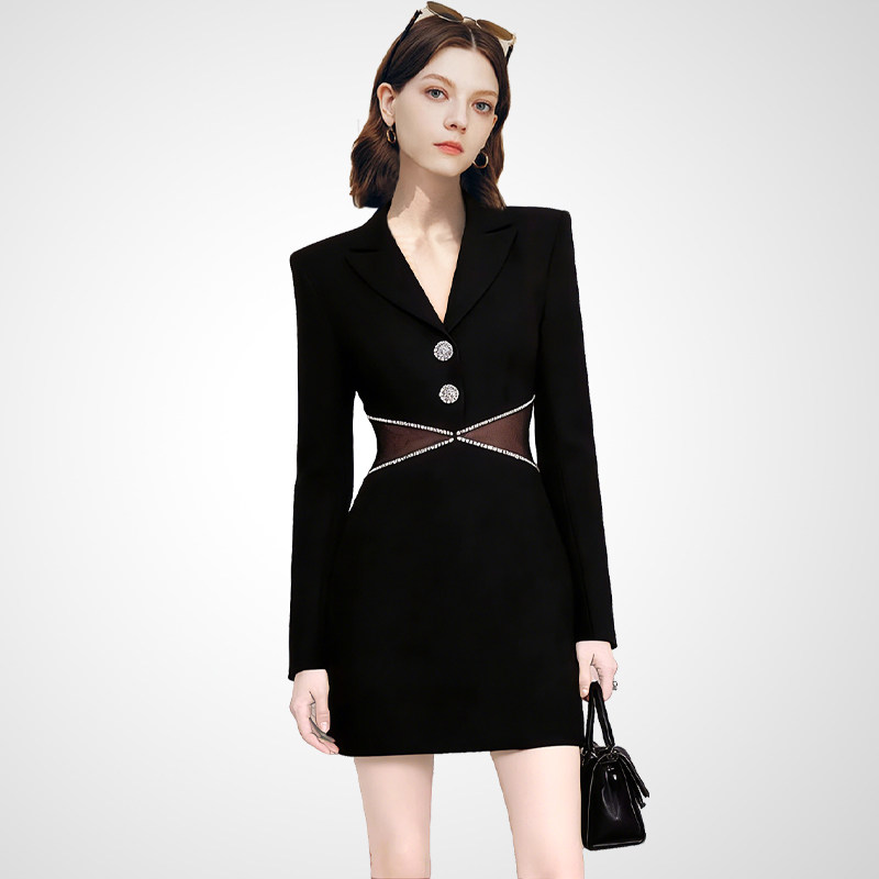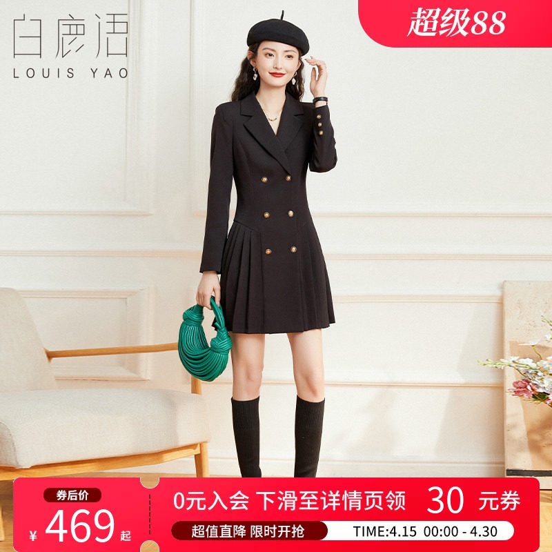 白鹿语赫本风高级感西装裙女2025春款气质黑色双排扣学院风连衣裙