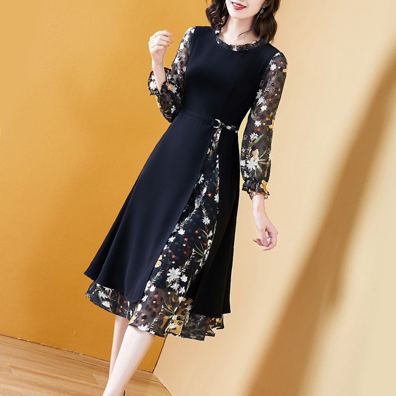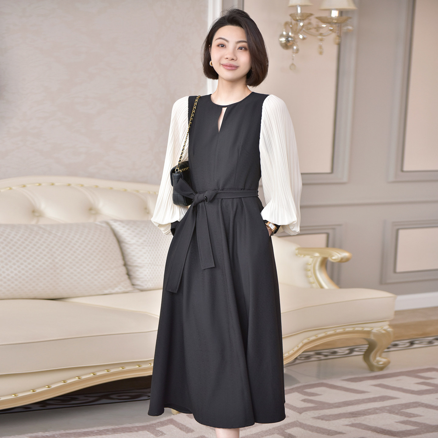 春款OL风格通勤长裙 赫本风黑色假两件拼接连衣裙 高腰聚酯纤维女