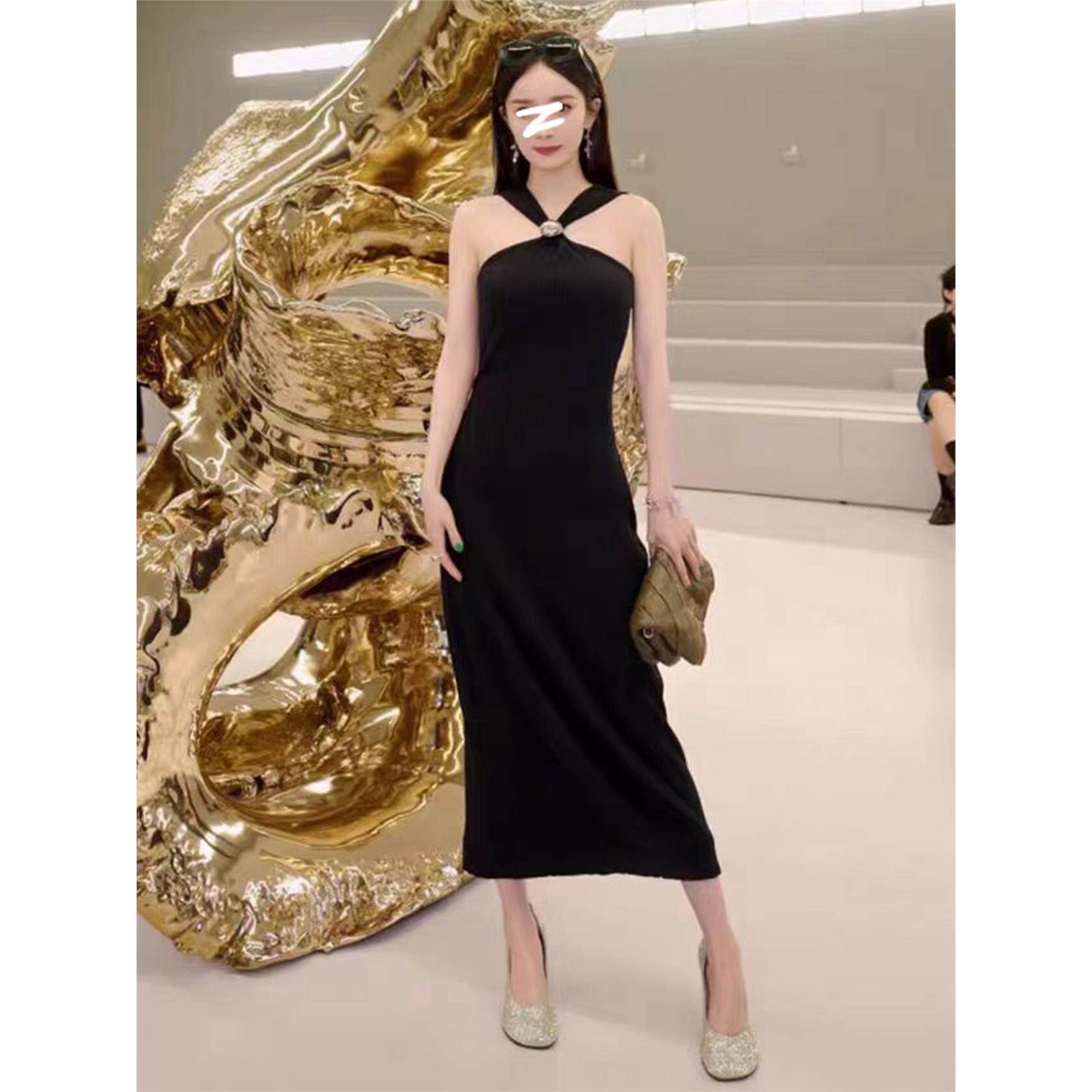 春款明星同款黑色挂脖露肩连衣裙女气质名媛风高级感修身显瘦长女