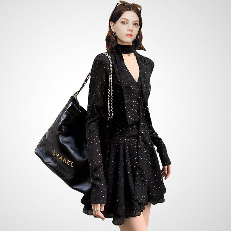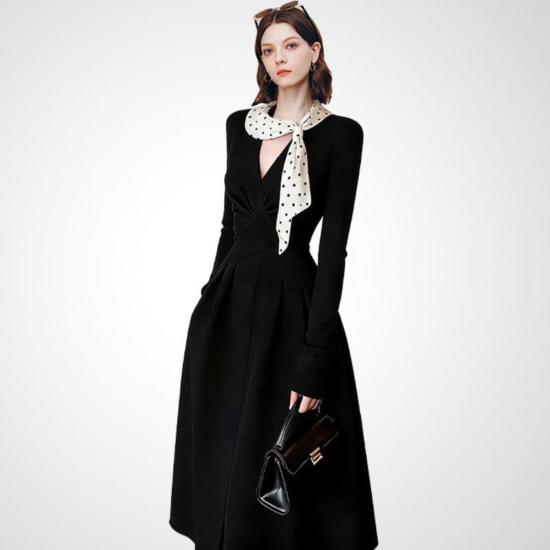 兰卡时尚春款黑色波点连衣裙女长袖V领收腰小个子轻奢复古气质裙