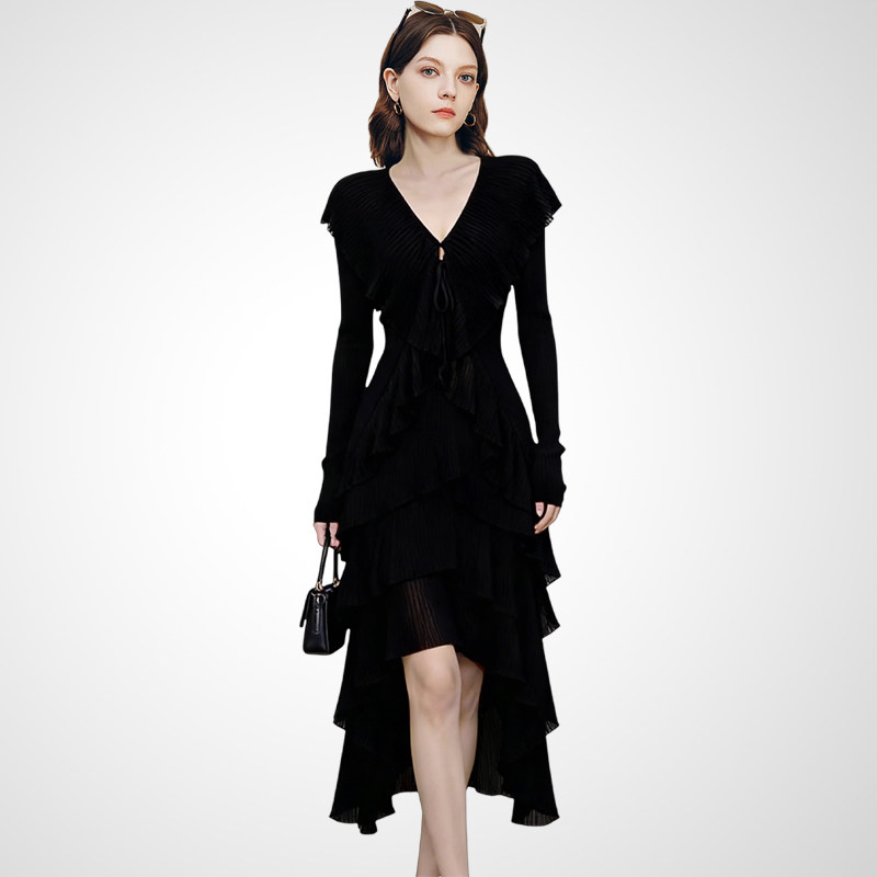 兰卡时尚法式千金感黑色连衣裙2026春款长袖V领收腰显瘦气质长裙