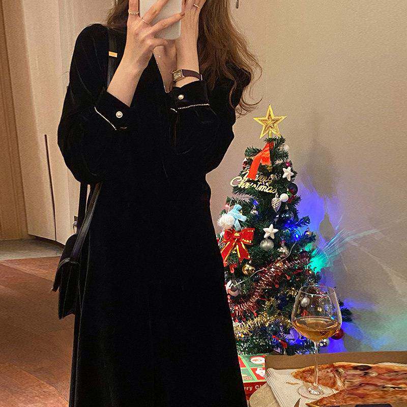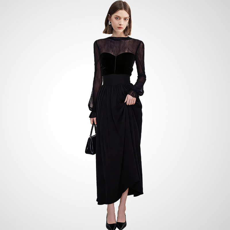 欧洲站女装2025新款春款法式覆古赫本风气质长裙金丝绒连衣裙黑色
