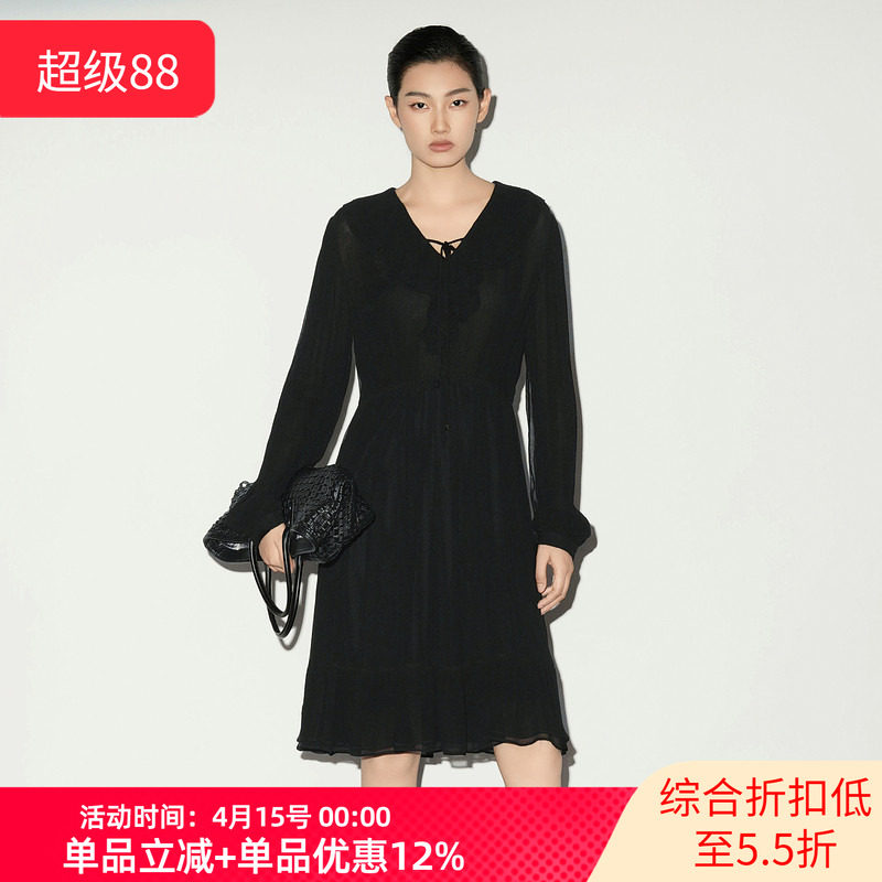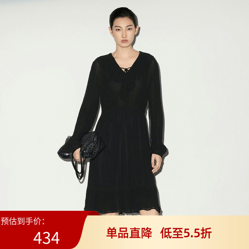 XG/雪歌26春款V领黑色连衣裙女长袖抽褶A字裙中长裙XL104006A390