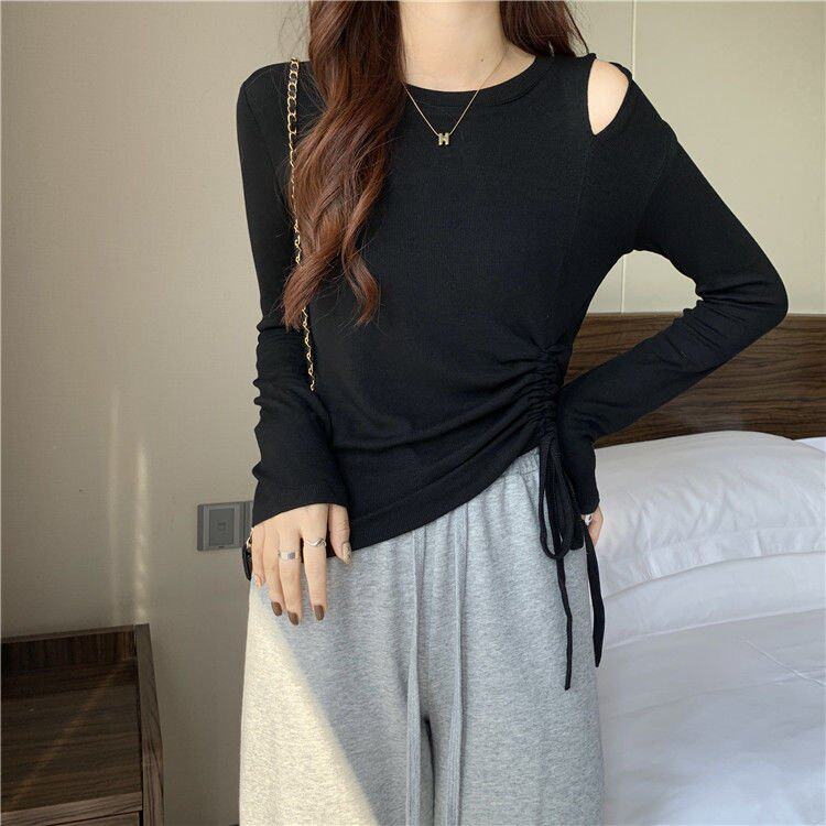 大码胖mm长袖T恤女设计捏褶收腰圆领上衣秋季净版百搭正肩打底衫