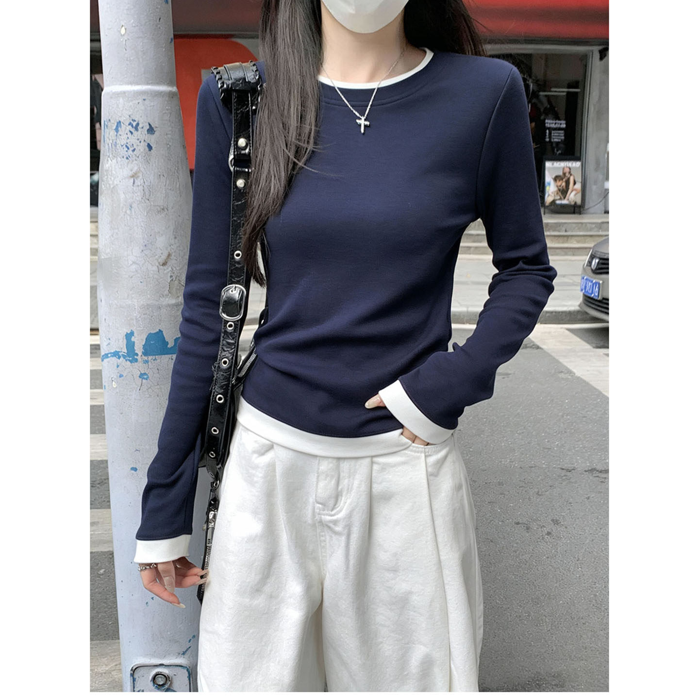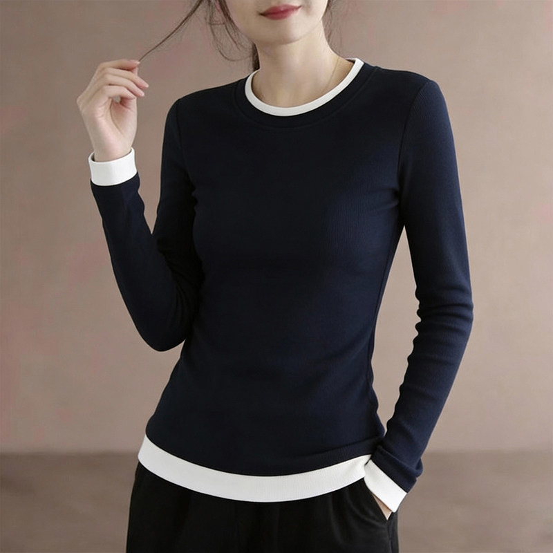 撞色假两件超好看内搭打底衫女大码胖mm长袖t恤新款修身蓝色上衣