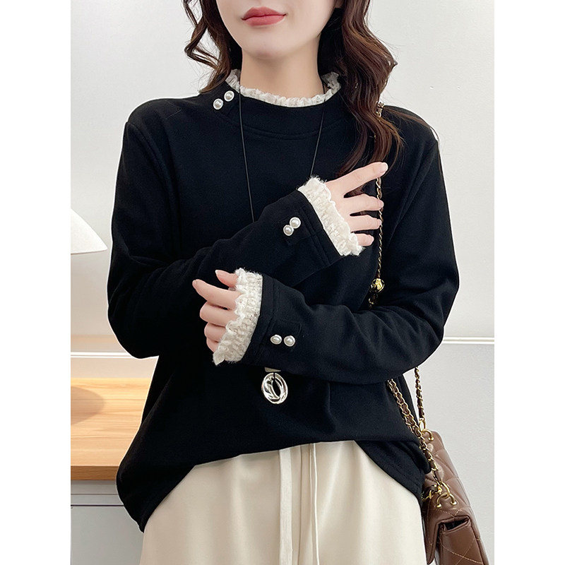 翠袖大码女装法式温柔风蕾丝花边内搭打底衫秋冬胖mm长袖T恤上衣