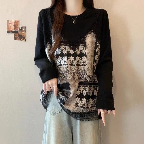 2025春秋新款复古印花宽松遮肉显瘦长袖拼接蕾丝大码胖mm长袖T恤
