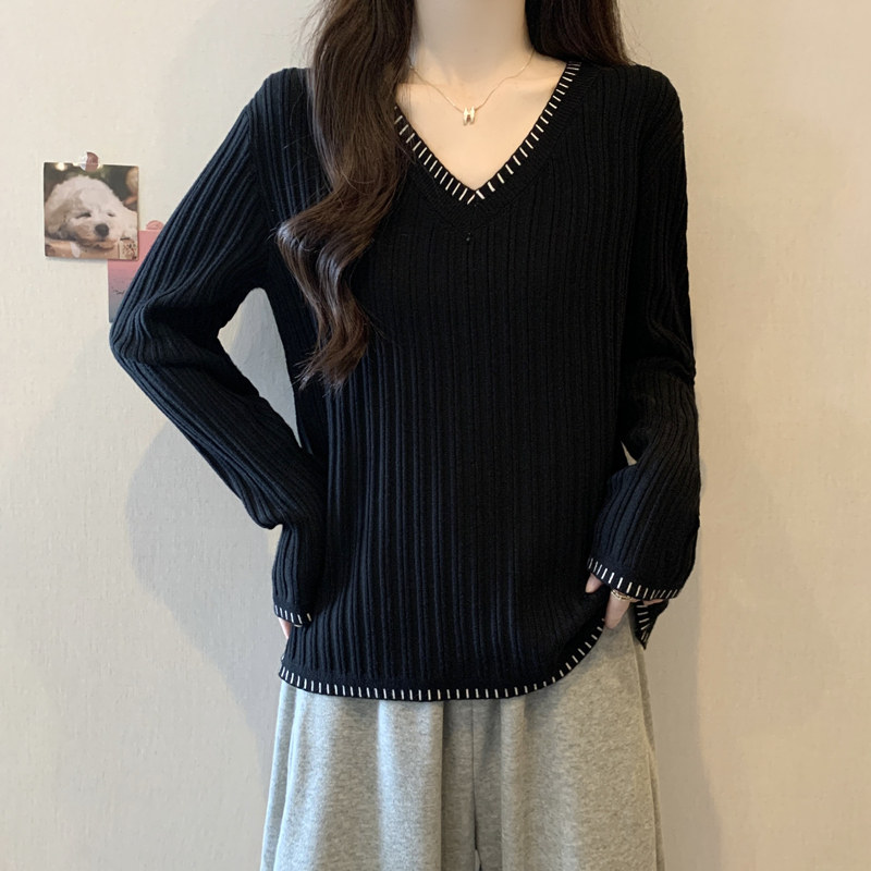 胖mm长袖t恤女打底衫2025新款洋气减龄宽松上衣v领针织衫内搭小衫