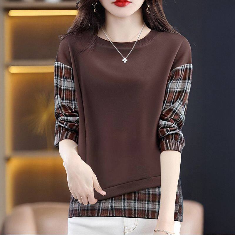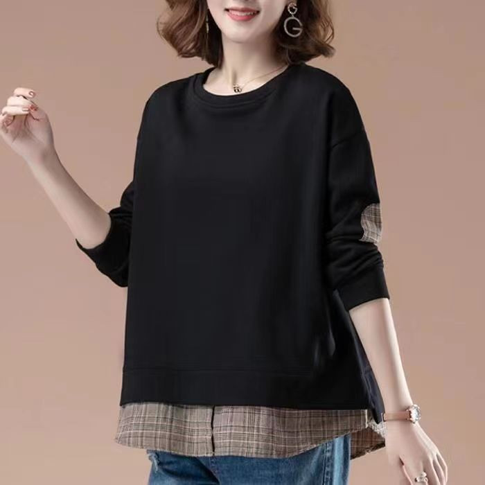 假两件卫衣春秋季大码胖MM长袖T恤减龄休闲女装韩版宽松格子上衣