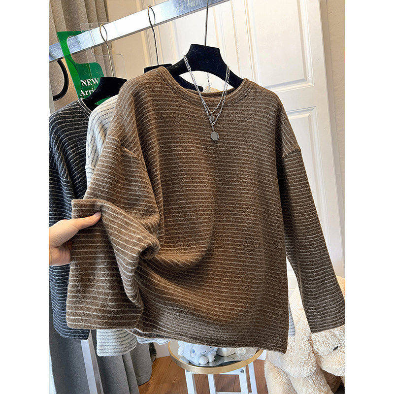 2025冬季条纹内搭打底衫上衣服韩系宽松显瘦大码胖mm长袖t恤女款