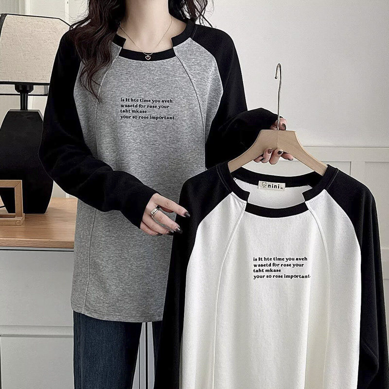 胖mm长袖t恤女2025年春季新款大码不规则领口字母印花拼色打底衫