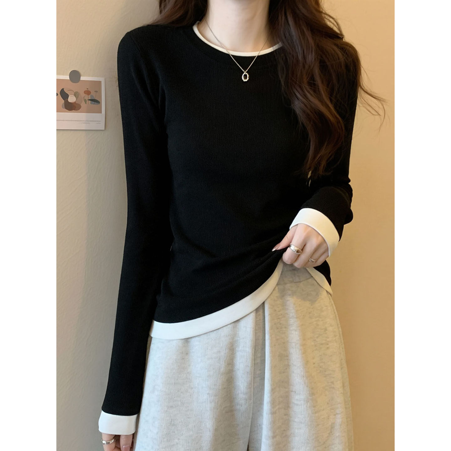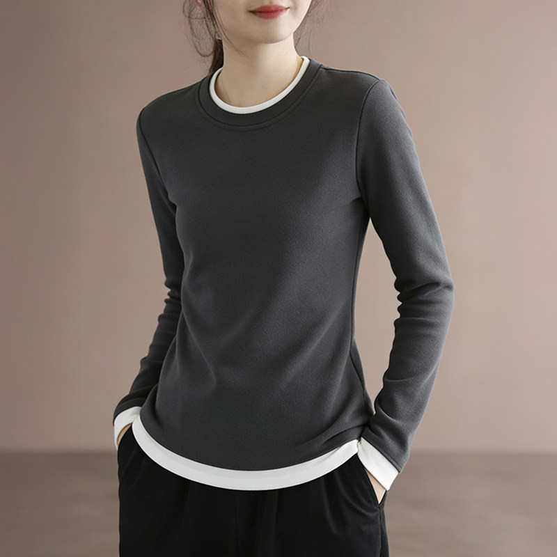 撞色假两件超好看内搭打底衫女大码胖mm长袖t恤新款修身黑色上衣