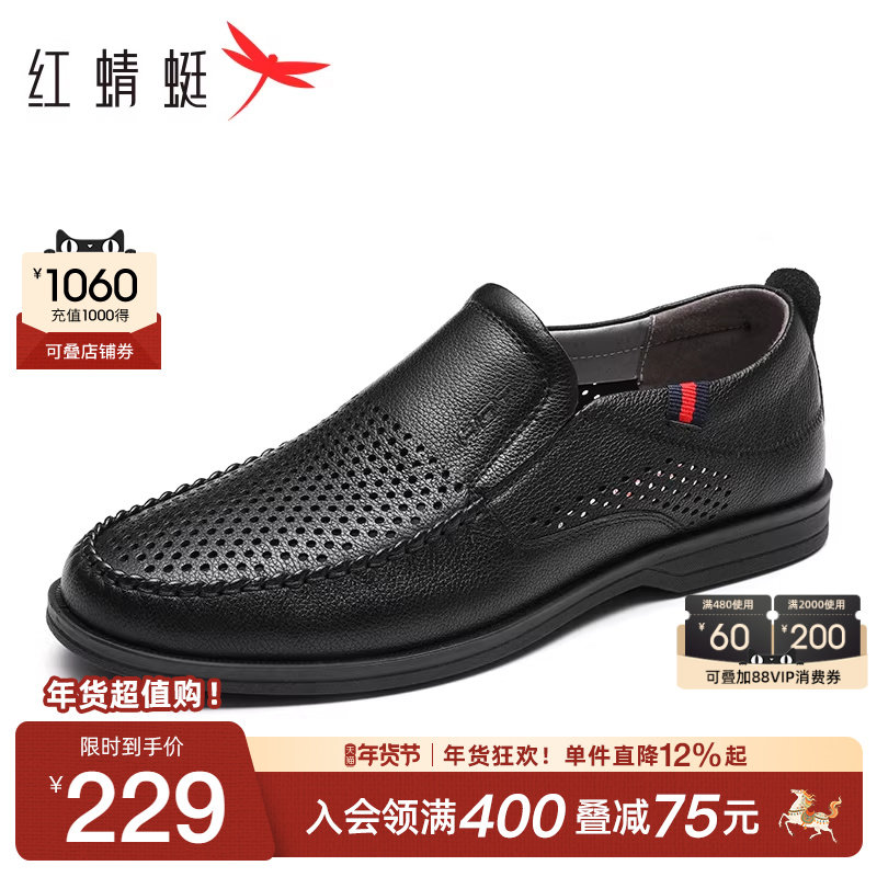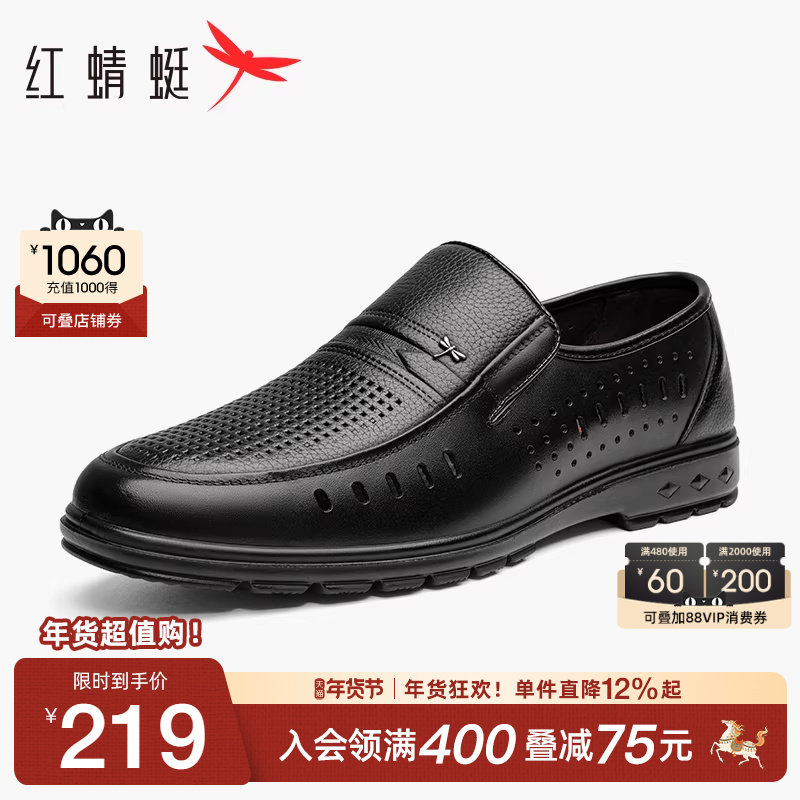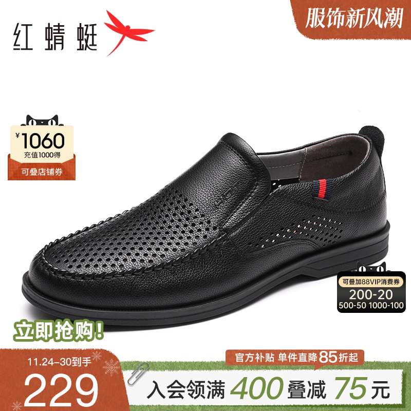 红蜻蜓男鞋夏季新款真皮男士休闲皮鞋镂空透气商务鞋中老年爸爸鞋