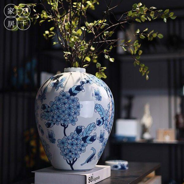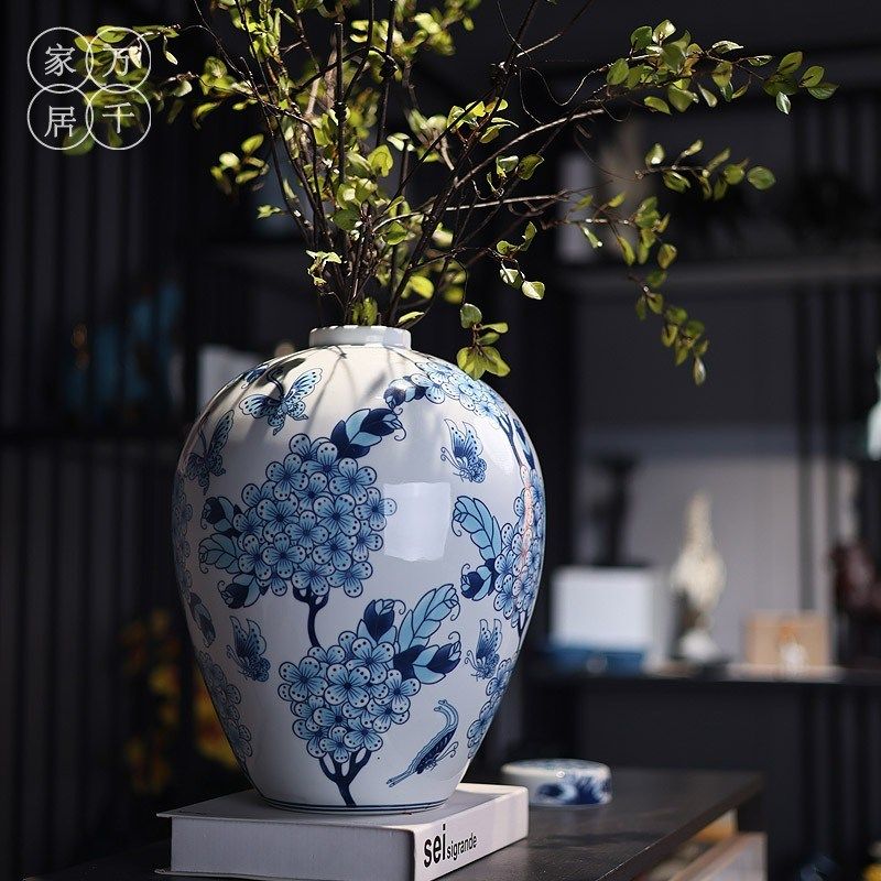 东方巴黎水墨青花瓷器大肚容福干花水培花瓶新中式玄关摆件软装饰
