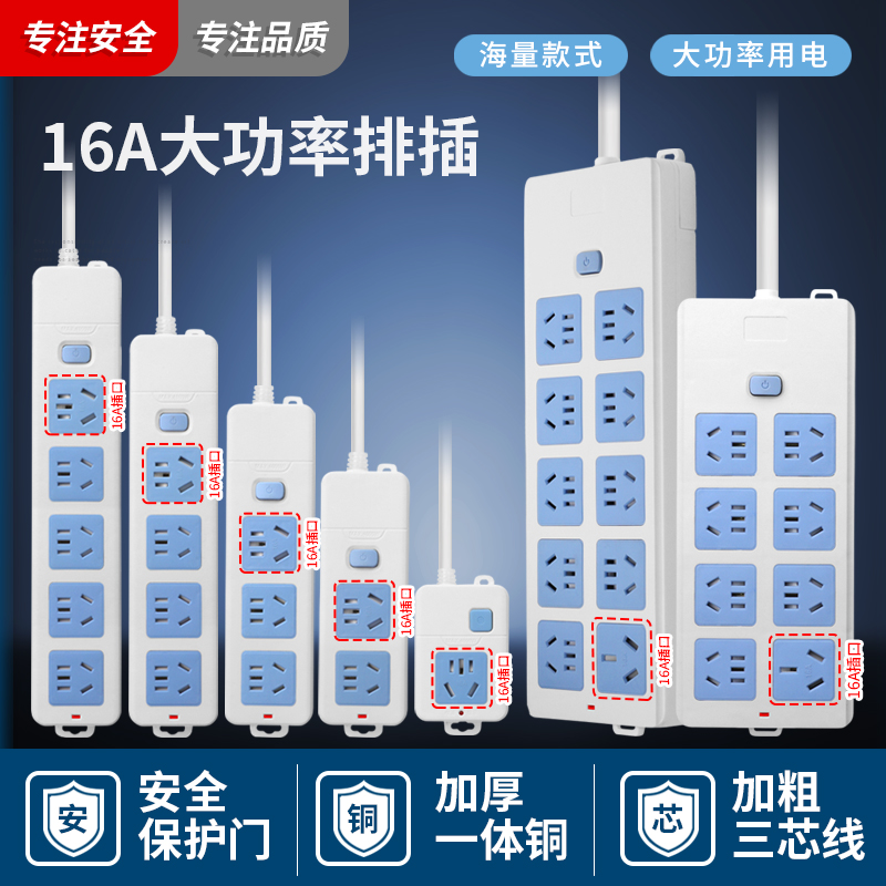 16A大功率4000W地拖插座防脱落工地办公家居插线板不带线排插防摔