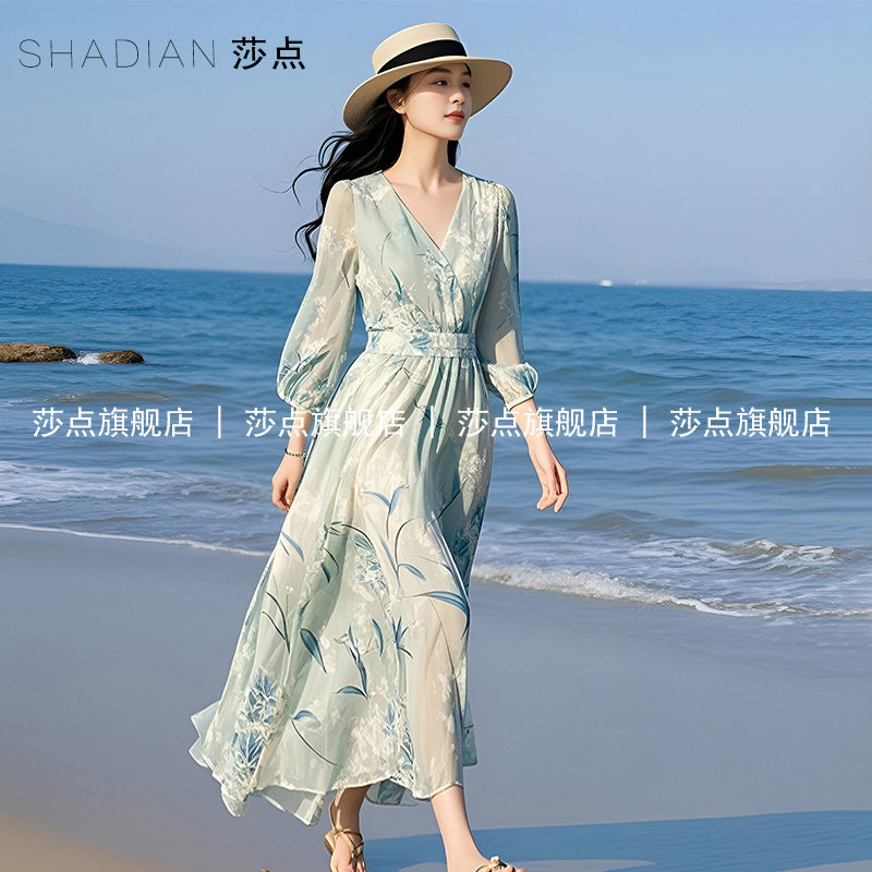 莎点荷叶边V领连衣裙雪纺大摆飘逸长裙海边裙子显瘦遮肉沙滩裙夏